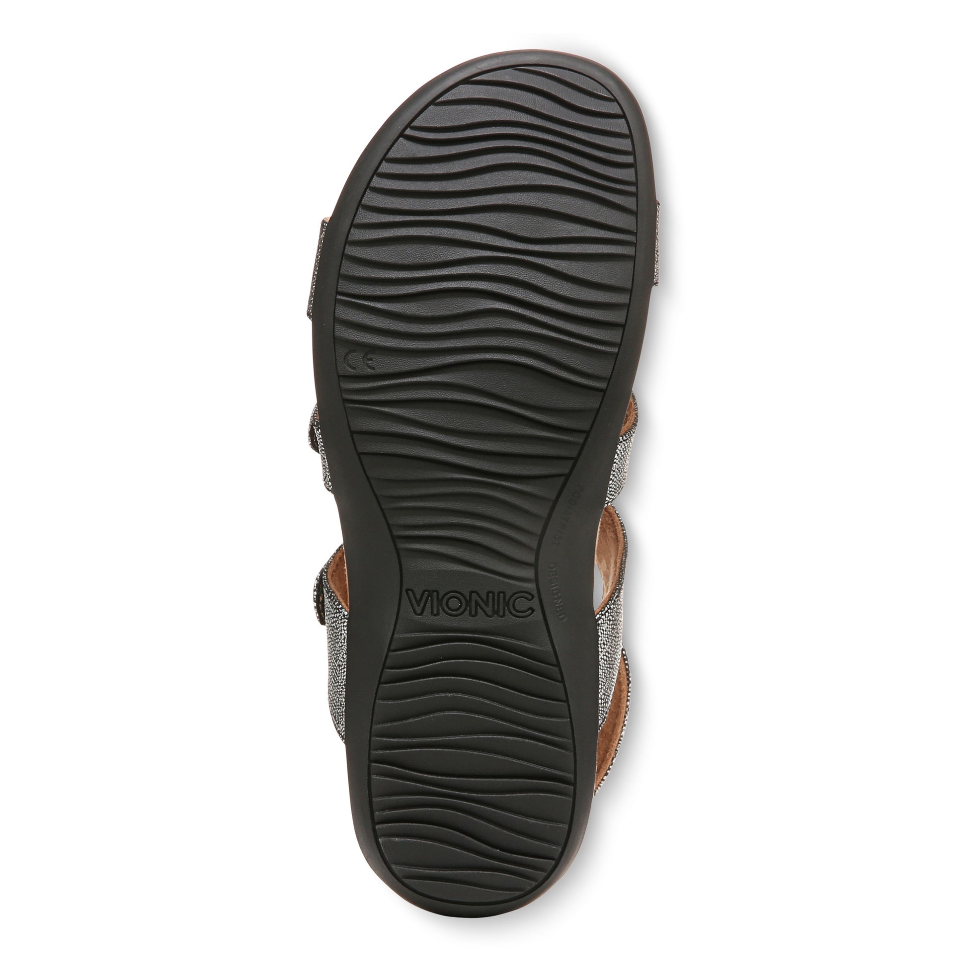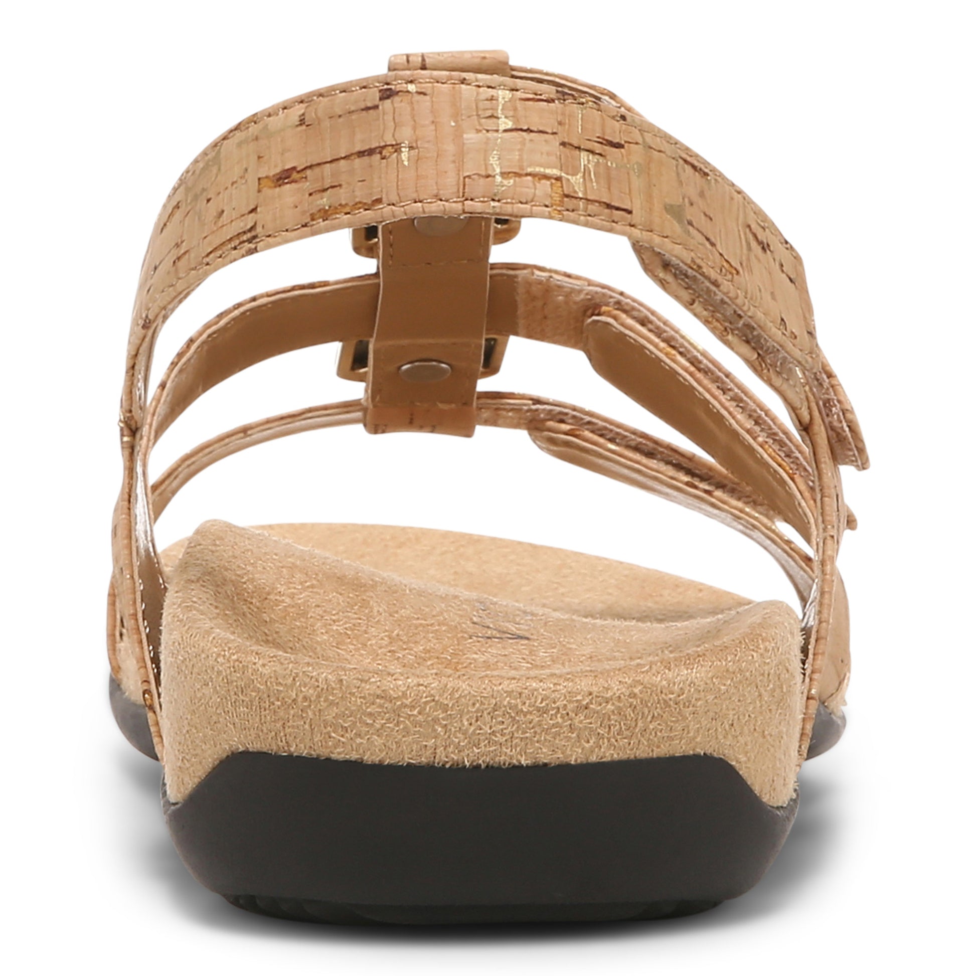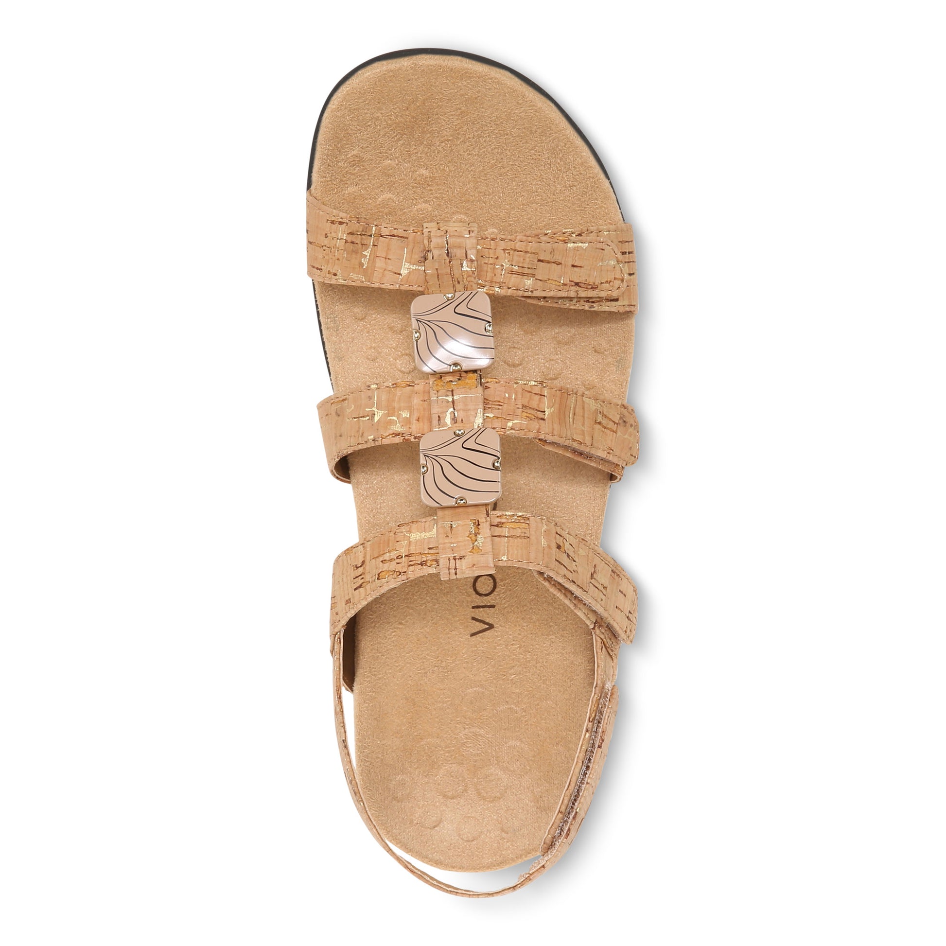 VIONIC AMBER, a smart and stylish sandal with four adjustable straps, including backstrap, great when your feet need a little more breathing room. These adjustable velcro straps deliver a completely custom fit. Natural gold cork or silver metallic linen upper with two square enamel trim beads adds interest to the top of the vamp.